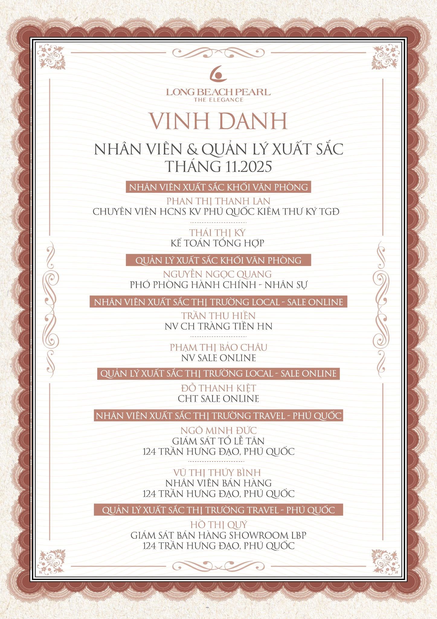 Việc duy trì chương trình vinh danh định kỳ không chỉ là sự động viên tinh thần, mà còn là chiến lược xây dựng văn hóa doanh nghiệp tích cực, nơi mỗi cá nhân đều cảm thấy tự hào khi là một phần của Long Beach Pearl.